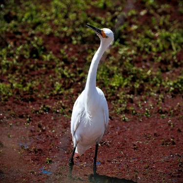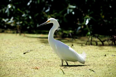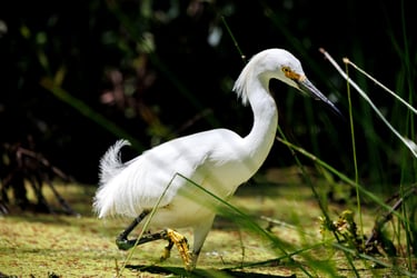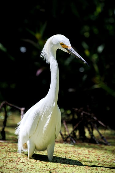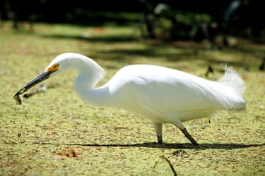 I was astonished to come to a moody clearing where a lone, Great Egret was hunting in the swamp. The swamp was covered in a florescent green algae, but the Egret was somehow able to pear through and score a direct hit to a baby frog.
